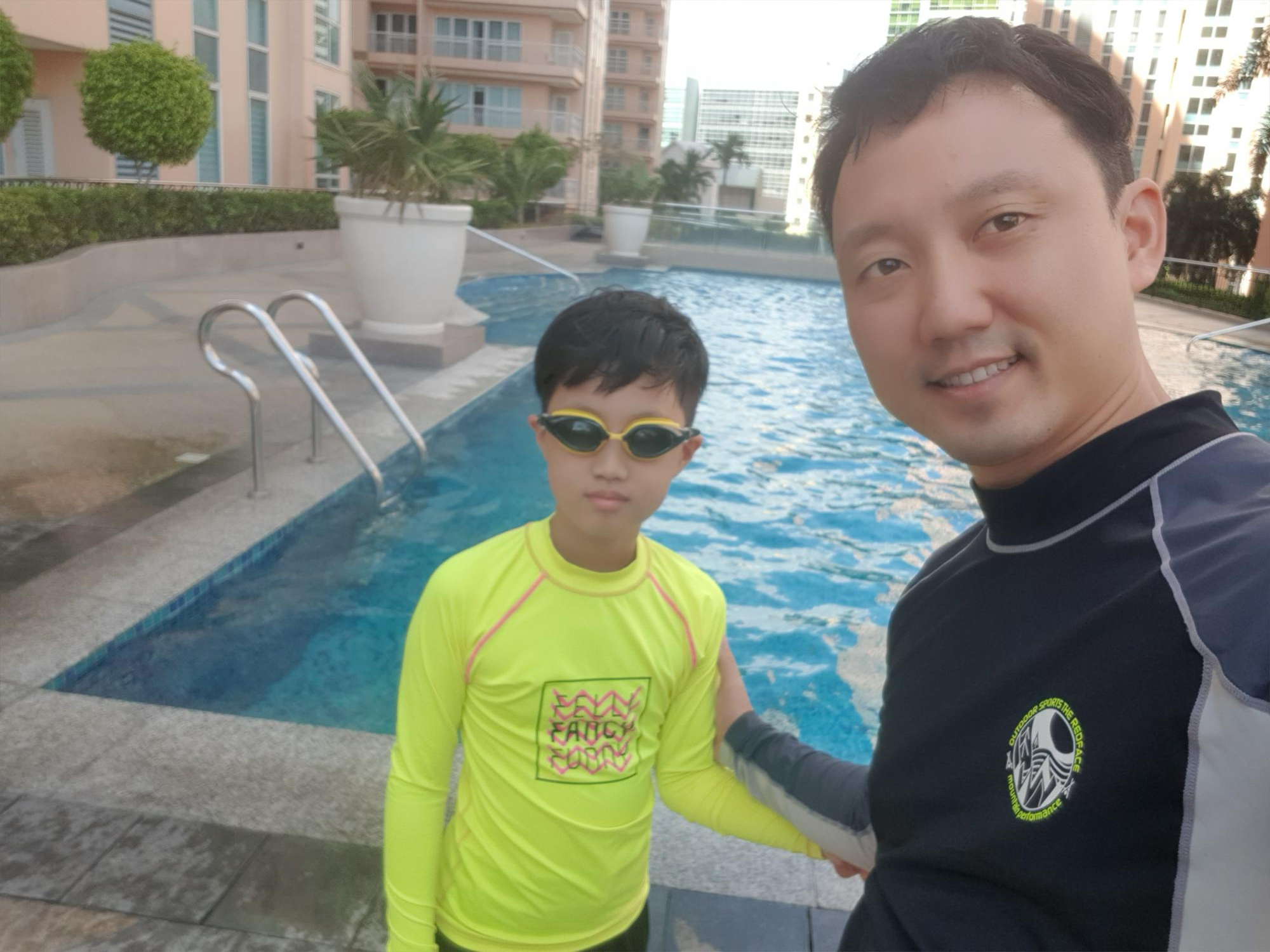 집으로 돌아오는 길에 수영장을 한번 스캔하고 올라갔어요. 3층에 수영장이 있는데요, 아침부터 수영하는 사람들이 있더라고요.