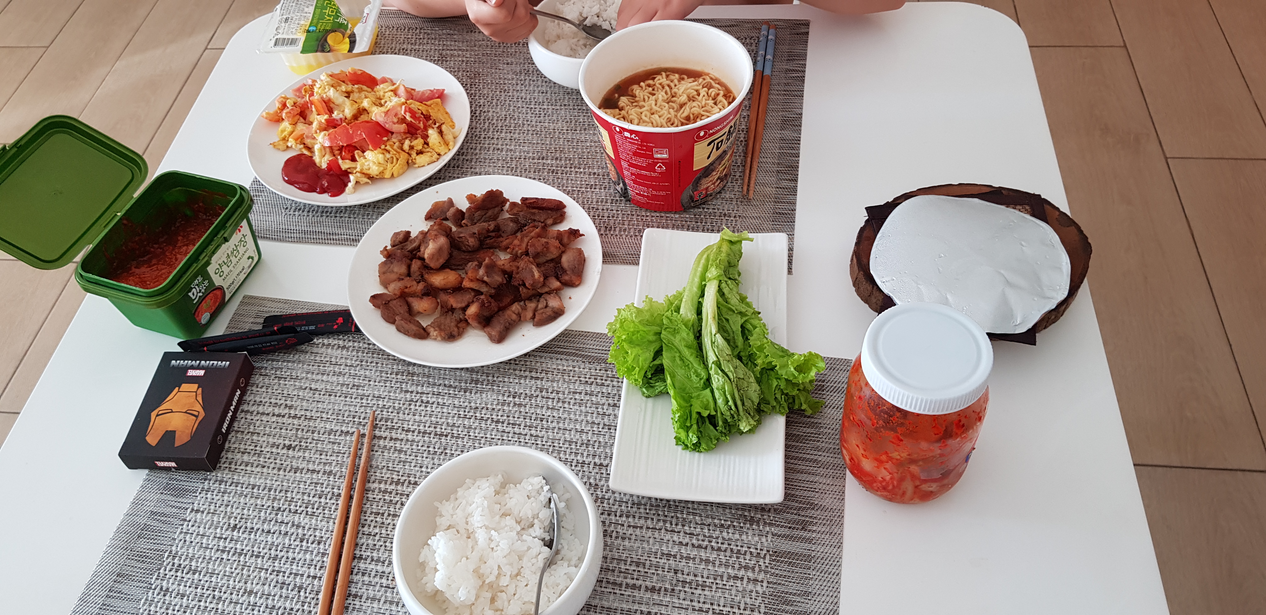 9시에 학교에서 모이기로 했기 때문에 아침 일찍 일어나 아침밥을 먹었습니다. 어제 저녁에 받아온 토마토가 있어서 계란과 섞어서 토마토계란볶음을 하고 남았던 고기를 전자레인지에 데워서 라면과 함께 먹었어요. 든든하게 먹고 갔습니다. 김치와 쌈장이 있으면 무적이죠. ㅎㅎ