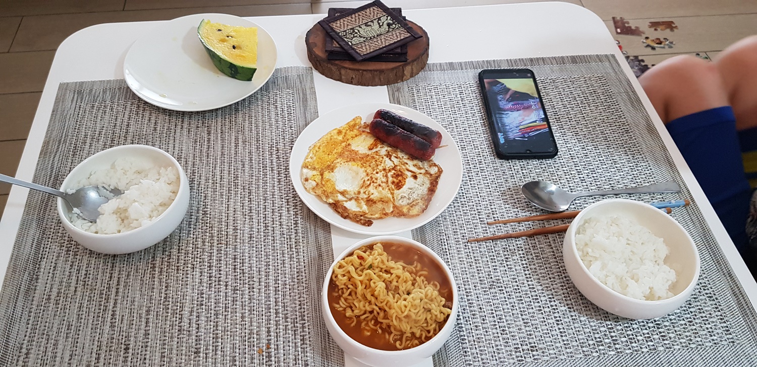 아침 겸 점심을 먹었습니다. 전날 장 볼 때 고기를 사려했는데 상태가 별로여서 안 샀더니 먹을 게 없어서 라면을 끓여 먹었어요.