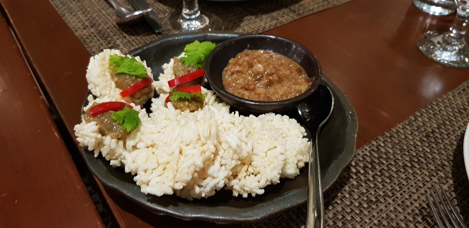 이건 튀긴 밥에 소스를 얹어 먹는 샐러드인데요,