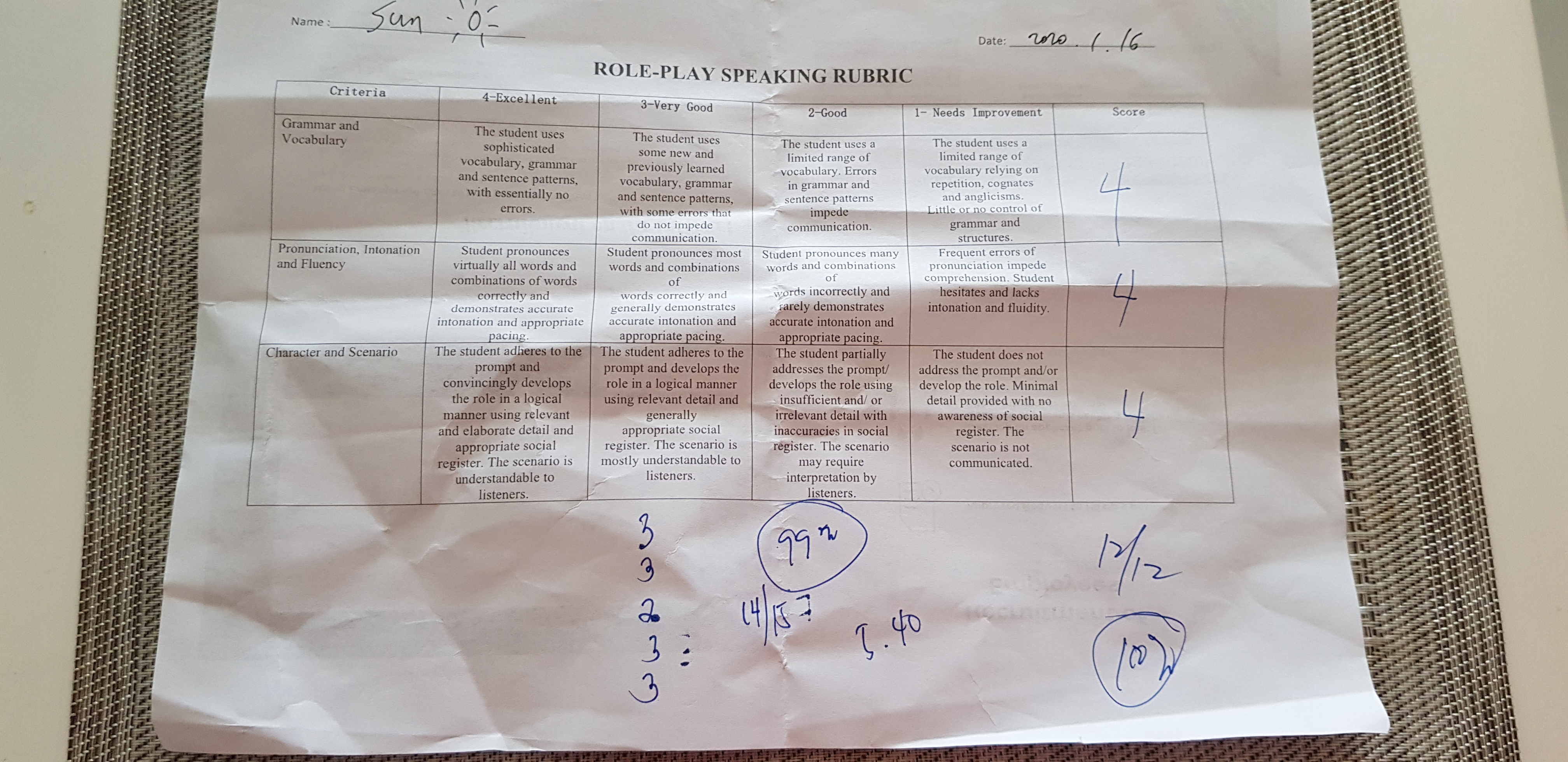 제가 받은 결과표이고요, 롤플레이는 100점이고, 스피킹 점수는 99점. 역시 문법이 약하네요. 저는 키워드 몇개 준비해서 즉석 해서 스피킹을 했는데요, TV의 장단점에 대해서 미리 장점을 7개, 단점을 5개 적어두고, 제 경험을 말해가며 쭉 시간을 끌다가 타이머에 5분이 되었을 때 마무리를 하는 전략으로 스피킹을 했어요. 단점은 5개 다 말했고, 장점은 3개 정도 이야기할 때쯤 5분이 되어서 마무리를 지었습니다. 즉흥적으로 하다 보니 문법이 정말 엉망이었나 봐요. 문법 공부 좀 더 해야겠습니다.