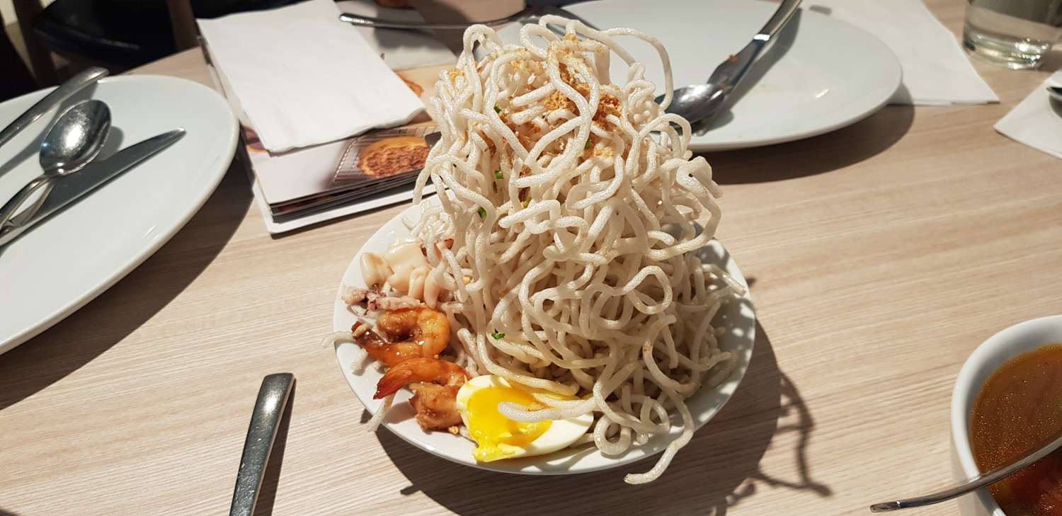 크리스피한 국수를 시켰는데 이름을 들었는데 까먹었어요. 튀긴 면이 산더미처럼 나오는데,