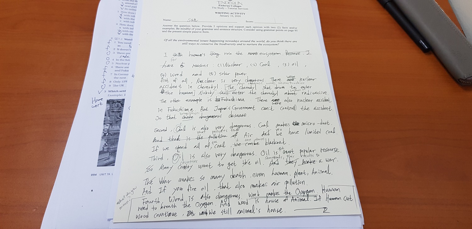 존은 정말 많은 준비를 해 왔는데요, 노트 두권을 가지고 나오는 열정을!!! 필리핀의 명문 대학이라는 라살 대학 경영학과를 목표로 준비 중이라고 합니다. 현재 엔더런대학교에서 5개월 공부했고, 1년간 어학연수 후 라살 대학에 도전할 계획이라고 해요. 열정이 정말 멋집니다!