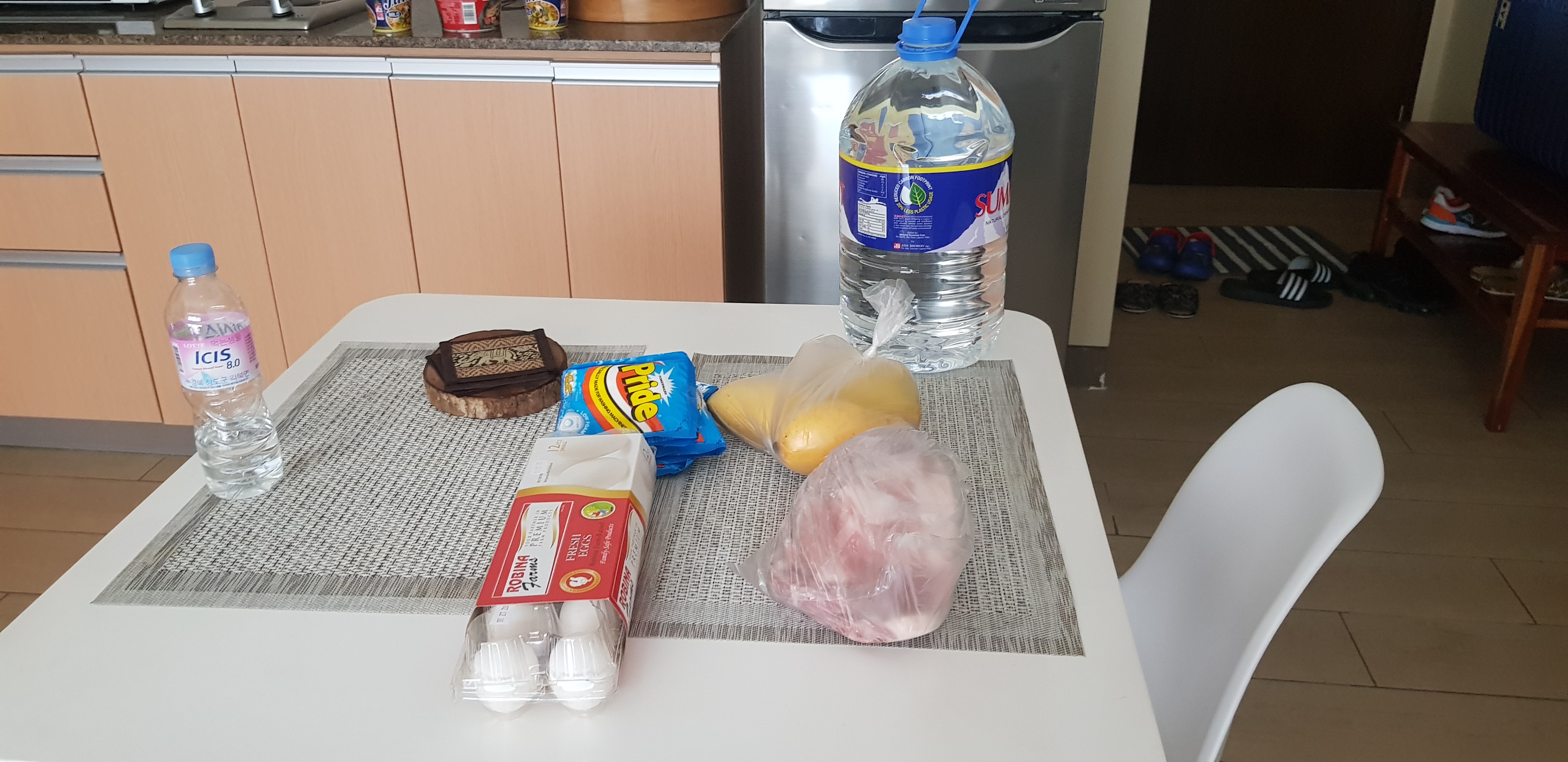 우선 장을 봐온 것들인데요, 로빈슨에서 계란과 목살, 망고, 세제, 물을 샀습니다.