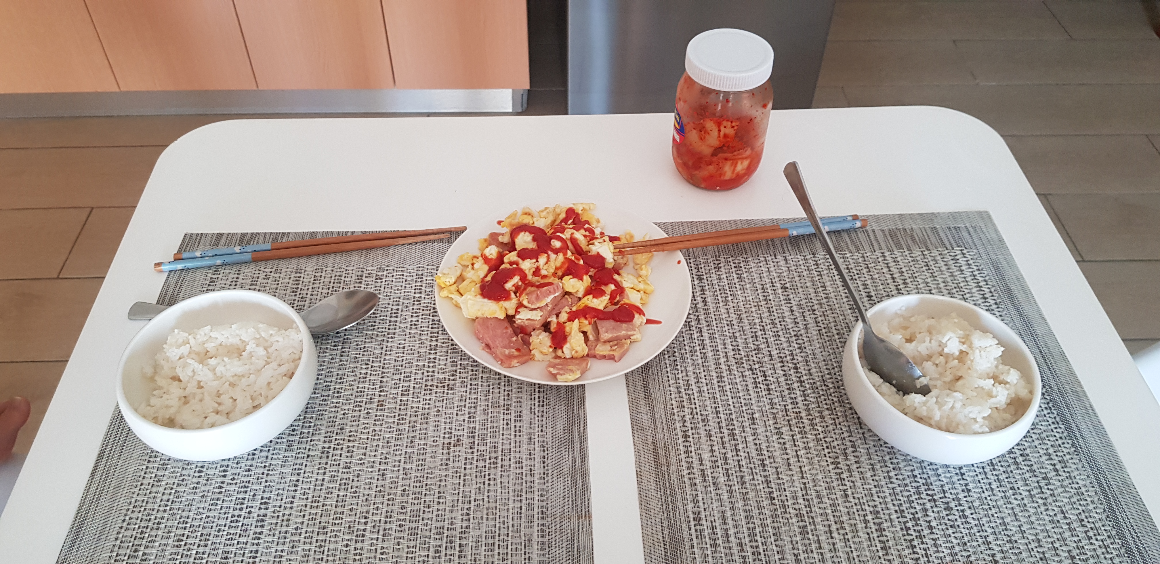 한인 슈퍼에서는 간식과 김치, 스팸, 참치, 튀김우동 ㅎ 단무지? 쌀을 샀어요.