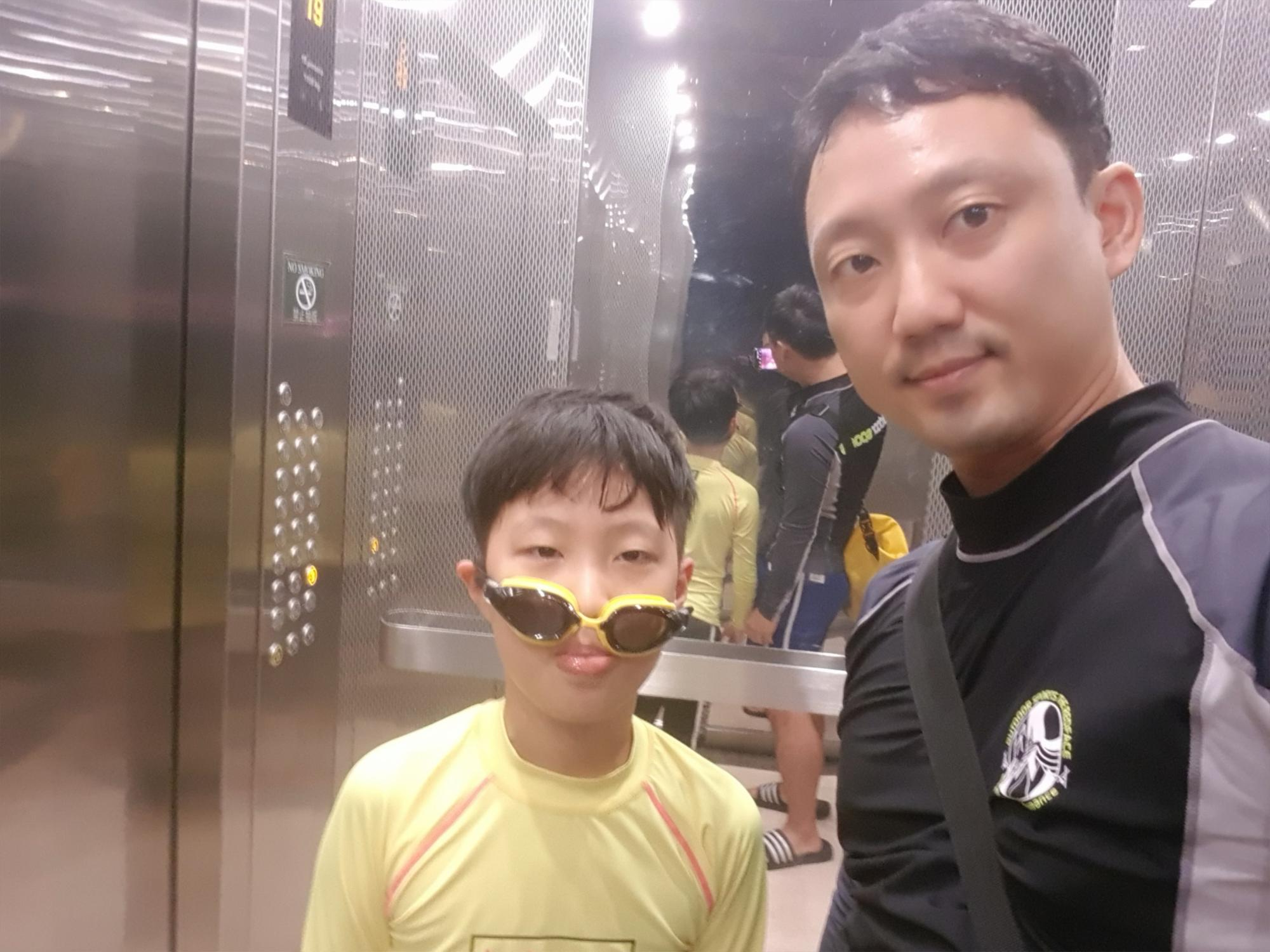 집으로 돌아오는 길에 수영장을 한번 스캔하고 올라갔어요. 3층에 수영장이 있는데요, 아침부터 수영하는 사람들이 있더라고요.