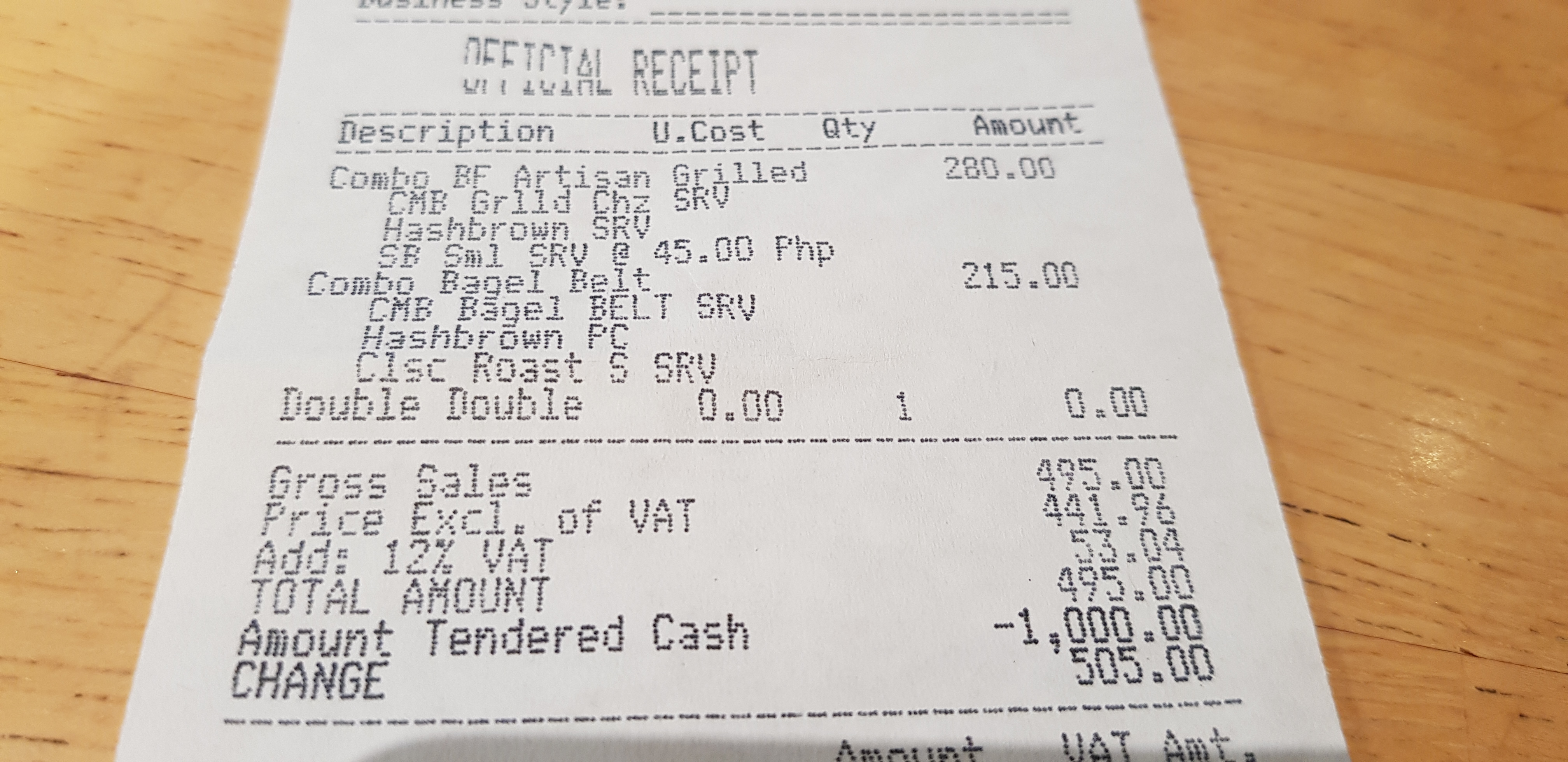 아들은 그릴드 치즈와 바나나 스토로베리 음료를 저는 베이글과 더블더블을 시켰습니다. 총 495페소가 나왔어요. 한국돈으로는 만원 정도 하는 가격입니다.