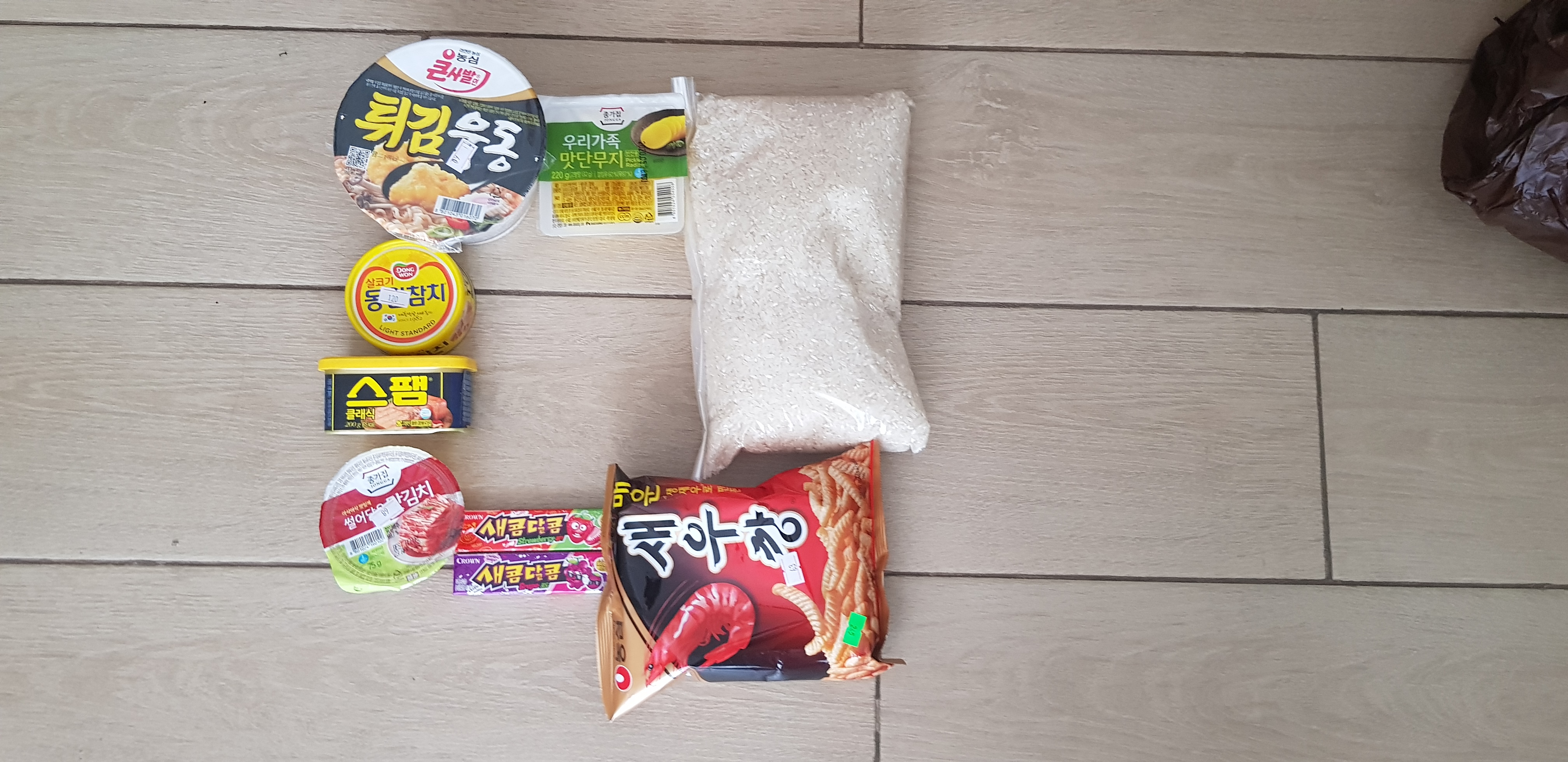 한인 슈퍼에서는 간식과 김치, 스팸, 참치, 튀김우동 ㅎ 단무지? 쌀을 샀어요.